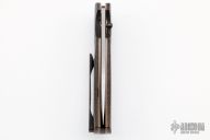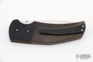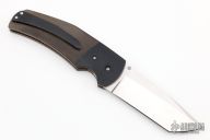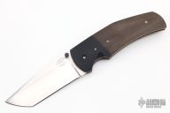 This Freelancer by Ranger Made Knives features a hand rub satin finish tanto blade with single thumbstud with thunderstorm kevlar inlay. The handle has titanium bolsters, micarta scales, orange peel and anodized titanium liners with jeweled interiors, anodized and matching backspacer and tip up clip. Nice detent, lockup and blade seating. Has a couple light scuffs, otherwise excellent condition.