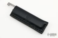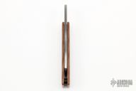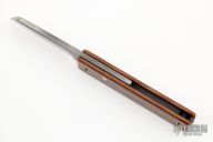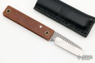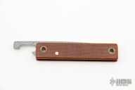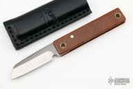 This Friction Folder by Mike Morris features a sheepsfoot style blade ground from a file. The handle has natural canvas micarta scales. Friction bar features a bottle opener. Comes with a black leather slip sheath and COA. Excellent condition.