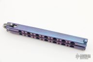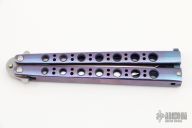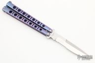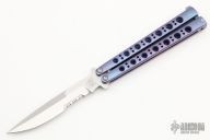 This Model 42AS Balisong features a tumble finished partially serrated blade and anodized titanium handles with an orange peel finish. Has T-latch. Includes original box and papers. Excellent condition.