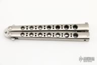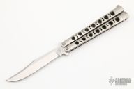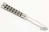 This Model 43 by Benchmade features a tumble finished blade. The handles are satin finished titanium with spring latch. Coems with original box, papers, and nylon sheath. Excellent condition.
