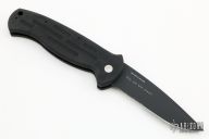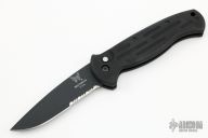 This Early AFO Automatic from Benchmade features a black drop point blade with swedge and partial serrations. The handle is comprised of black aluminum with a lanyard hole in pommel. Includes a nylon sheath and original box and papers.