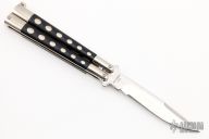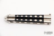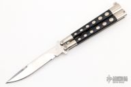 This Balisong by Benchmade features a polished Weehawk blade with false top edge. The handles are chrome plated zinc with black plastic inlays. Comes with a Benchmade box. Has some scuffs and scratches, otherwise good condition.