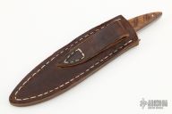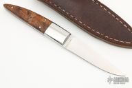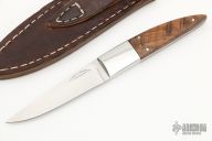 This GSK (Gentleman's Side Knife) by Brent E Sandow features a hand rub satin finished blade, .125" blade stock and .822" blade depth, full tapered tang construction. The handle has mirror polished stainless steel bolsters, and wild olive scales with black liners. Comes with a brown leather sheath. Excellent condition.