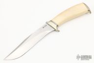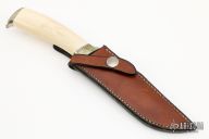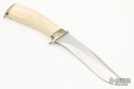 This knife by Jim Siska features a hand rub satin finished recurve blade with a sharpened top edge and fileworked spine, .193" blade stock and 1.120" blade depth, hidden tang construction. The handle has a nickel silver guard and butt, mammoth ivory grip and black and nickel silver spacers. Comes with a brown leather sheath dated '96. Excellent condition. Has some minor patina on the nickel silver, has a slight separation between the guard and the grip.
