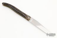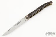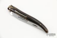 This Slipjoint by Laguiole features a mirror finished clip point blade with a nail nick. The handle carved buffalo horn covers with brass liners and a fileworked stainless steel spring. Excellent condition.