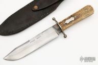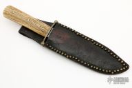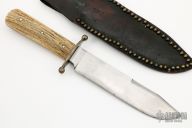 This knife is very old and has clearly been used and resharpened many times over a period of over 100 years. Has a really beautiful patina. Stamped "Green River " on the blade. The handle has a nickel silver guard and escutcheon, two-piece stag grip. Comes with a black leather sheath and a zippered case. Has some scratches, has been sharpened, has patina, otherwise good condition.