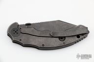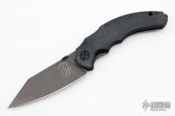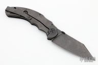 This Bastinelli Dragotac by Lionsteel features a black tumbled sheepsfoot blade with large thumbdisc and notched thumbrest. The handle has a black G-10 and tumbled titanium frame with black backspacer and tip up stainless steel clip, lanyard hole at the butt. Nice detent, lockup and seating. Excellent condition.