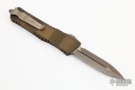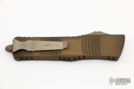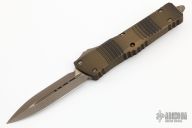 This Combat Troodon OTF automatic features a bronze apocalyptic blade with a standard edges. Antique bronzed aluminum handle with a tip down blasted stainless steel clip. Glass breaker. Serial number 113 and dated 08/2022. Comes with original box and papers. Excellent Condition.