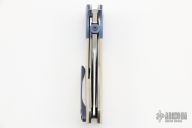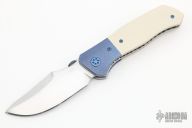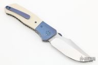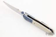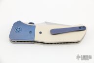 This Superstition Linerlock by KC Gray features a hand rub satin finished blade with thumbdisc. The handle has anodized titanium bolsters, ivory paper micarta scales, orange peel finished titanium liners, anodized titanium tip up clip. Nice detent, lockup and blade seating. Rides on bearings. Comes with zippered case and COA dated 7-21. Has a few light scratches, otherwise excellent condition.