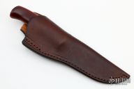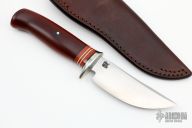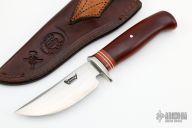 This Skinner by James Behring features a satin finished blade with .171" blade stock and 1.31" blade depth, hidden tang construction. The handle has a sterling silver guard, stag grip with black/red/white spacers. Comes with a brown leather sheath with belt loop by Rowe's Leather. Comes with zippered case. Excellent condition.