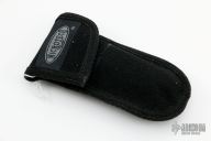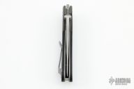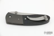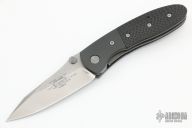 This Lightfoot LCC D/A side opener by Microtech has a stonewashed blade, black aluminum bolsters, and carbon fiber scales. Stainless steel clip and liners. Dated 09/2002 and #7787. Excellent condition. Includes a nylon sheath.