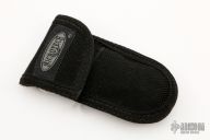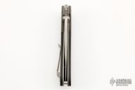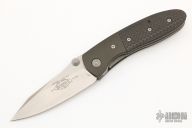 This Lightfoot LCC D/A side opener by Microtech has a stonewashed blade, black aluminum bolsters, and carbon fiber scales. Stainless steel clip and liners. Dated 09/2002 and #7519. Excellent condition. Includes a nylon sheath.