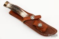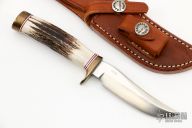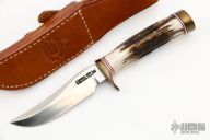 This Miniature Model 3 Hunter by Randall features a stainless steel blade with false top edge, .180" blade stock and .815" blade depth, hidden tang construction. The handle has a brass guard and butt, and stag grip with red/white/blue spacers. This knife is part of a limited edition and is numbered 2181. Comes with a brown leather sheath and a zippered case. Excellent condition.