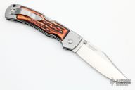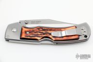 This Mackinac Hunter by Cold Steel features a satin finished blade with dual thumbstuds. The handle has a stainless steel frame with faux jigged bone scales, tip up reversible clip. Excellent coniditon. Discontinued.