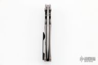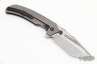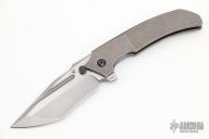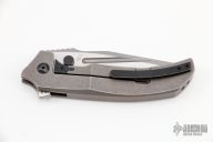 This Satori by Custom Knife Factory is a Peter Rassenti Design, the blade is satin finished with notched thumbrest and flipper. The handle has a black tumbled titanium frame with tip up black titanium clip, lanyard hole, stainless lock face insert with overtravel stop. Rides on bearings, nice detent, lockup and blade seating. #187 on flipper tab. Comes with nylon Velcro case and COA. New condition.