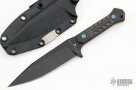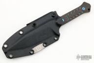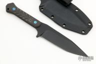 This Fedele X by Blackside Customs features a black DLC blade with notched thumbrest, .197" blade stock and 1.178" blade depth, full tang construction. The handle has carbon fiber scales with blue titanium hardware. Comes with a kydex sheath with logo plate and soft loop, original box and COA dated "Micro Batch 2022". New from maker.