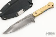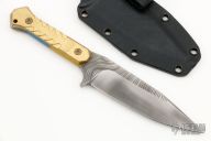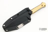 This Fedele X by Blackside Customs features a Beskar finished blade with notched thumbrest, .197" blade stock and 1.178" blade depth, full tang construction. The handle has brass scales with bronzed titanium hardware. Comes with a kydex sheath with logo plate and soft loop, original box and COA dated "Micro Batch 2022". New from maker.