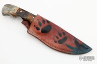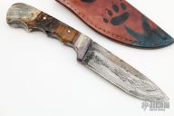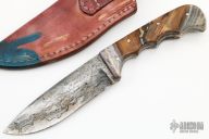 This Hunter features a Damascus drop point blade with a full tang construction. .183" Blade Stock. 1.312" Blade Depth. The handle features dyed wood scales. Includes a leather sheath. Oxidation is visible on the blade. New from maker!