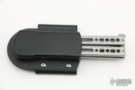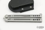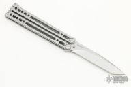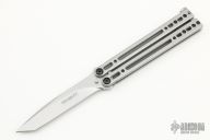 This Kimura 11 Balisong by Bradley Cutlery has a bead blasted tanto blade. The handles are bead blasted stainless steel with latch at the butt. Latch can be reversed. Excellent condition. Comes with a molded sheath.