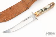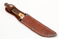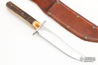 This Hunters Bowie from Case Knives features a mirror polished blade with false top edge, .097" blade stock and .975" blade depth, full tang construction. The handle has a nickel silver guard, stag scales. The scales have scrimshaw. Includes original brown leather sheath. Excellent condition. #0710