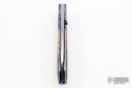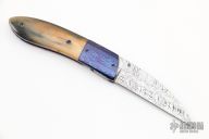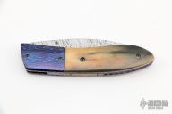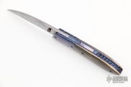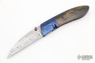 This folder by Skiff Made Knives features a damasteel blade with a single thumbstud that has a purple stone inlay. The handle has blued Mosaic Damascus dovetailed bolsters, mammoth ivory scales, anodized and fileworked titanium liners, fileworked Damascus backspace with mother of pearl inlay. Smooth action with a nice detent, lockup and blade seating. Excellent condition.