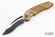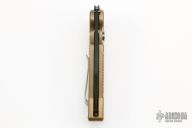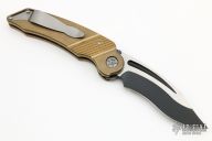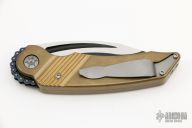 This MRX by Rat Worx features a recurve blade with satin finished flats. The handle is bronze with a chain drive opening mechanism. Tip up bead blasted stainless clip. Comes with original box. Excellent condition.