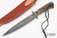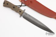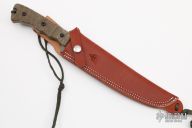 This Wild Pig Hunter by Tops Knives features a "black river wash" finished blade with false top edge, .245" blade stock and 1.309" blade depth, full tang construction. The handle has green canvas micarta scales with red liners. Comes with brown leather sheath.   Excellent Condition.