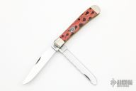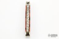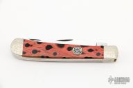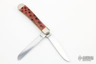 This slipjoint by Maker Moore features satin finished blades with nail nicks. The handle has nickel silver bolsters, pink covers with nickel silver escutcheon, brass liners and stainless steel springs. Includes a padded zippered case.  Excellent condition.