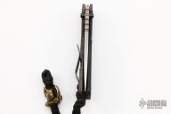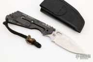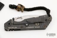 This SNG by Strider is a collaboration with Starlingear and the USN, it features a stonewashed blade with notched thumbrest and thumbhole. The handle has a black G-10 and flamed titanium frame with matching tip up clip. "USUAL SUSPECT NETWORK" and "015" on the handle. Has an antiqued copper Slickster Grenade bead with Strider Logo. Nice detent, lockup and blade seating. Has some a couple light scuffs, otherwise excellent condition.