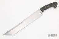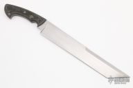 This Tanto Chopper by Daniel Frazee features a hand rub satin finished blade with a false top edge, .262" blade stock and 1.958" blade depth, full tang construction with black linen micarta scales. Coems with a zippered case, patch and makers card. The very tip is missing, but I almost didn't even notice it, otherwise excellent condition.