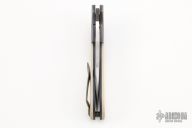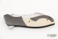 This Vanquish flipper from Jeremy Marsh features a hand rubbed satin finished blade with notched thumbrest and a flipper. The handle has tumbled titanium bolsters, ivory paper micarata scales, anodized and bead blasted titanium liners, tumbled titanium tip up clip. Nice detent, lockup and blade seating. Has some scuffs and scratches, has a small pitted spot underneath the makers mark, otherwise good condition.