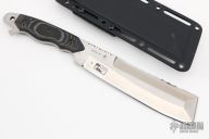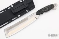 The CRKT Razel SS7 is a work tool with the look of a cleaver and the heft of a hatchet. The full-tang 9Cr18MoV steel blade is 0.25" thick with cutting edges of 1.70" and 7.25", plus a 3.70" top cutting edge with patented Veff serrations. The butt features a hardened steel window-breaker tip and bottle opener. The CRKT production Razel model has a hand-contoured black linen micarta scales, and custom-fitted Kydex sheath. Comes with original sheath and COA. This one is marked "Razel Owners Group #9".