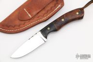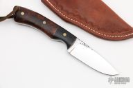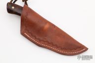 This Hunter by RA Matt features a mirror polished blade with fileworked spine, .152" blade thickness and 1.087" blade depth, full tang construction. The handle has laminated wood bolsters, ironwood burl scales with brass pins and brass liners, fileworked tang spine. Comes with a hand tooled brown leather sheath. Has some light scratches, otherwise excellent condition.