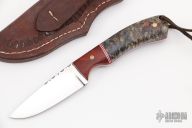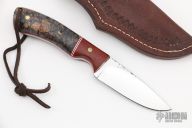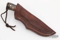 This Hunter by RA Matt features a mirror polished blade with fileworked spine, .148" blade thickness and 1.087" blade depth, full tang construction. The handle has wood bolsters, box elder burl scales with brass pins and red liners, fileworked tang spine. Comes with a hand tooled brown leather sheath. Has some light scratches, otherwise excellent condition.