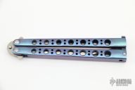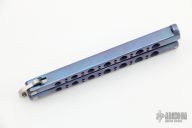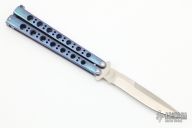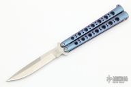 This Model 42A Balisong features a satin finished drop point blade and anodized titanium handles with an orange peel finish. Has T-latch. Includes original sheath. Excellent condition. Pre-Production 183/200