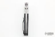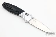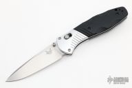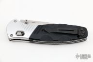 This 581 Barrage by Benchmade features a stonewashed drop point blade with AXIS assist locking mechanism. The handle has milled aluminum bolsters and carved black G10 scales. It has a milled g10 backspacer, a lanyard hole at the butt, and a reversible tip up carry clip. Nice action, lockup and blade seating. Excellent condition. Comes with a Benchmade belt sheath.