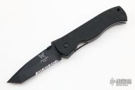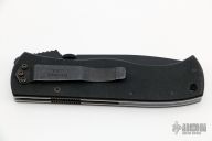 The 970SBK is the Benchmade version of the Emerson CQC7 folder. It has a black chisel ground partially serrated blade with notched thumbrest and a thumbdisc. The handle has black G-10 scales, titanium liners, black backspacer, lanyard hole, tip down black stainless clip. Excellent condition.