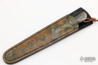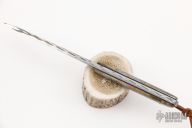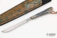 This Desk Knife by Anders Hogstrom features a Damasteel blade with .164" blade stock and .436" blade depth, full tang construction. The handle has AAA Grade North Sea Mammoth ivory scales with black liners, lanyard hole at the butt of the tang. Comes with a leather desk sheath. Comes with nylon velcro case. New from maker.