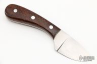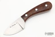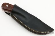 This fixed blade from Mike Mooney features a hand rub satin finished blade with notched thumbrest and a full tapered tang construction, .151" Blade Stock.  1.375" Blade Depth. The handle has burl wood scales. Includes a black leather sheath and a padded zippered case. Excellent condition.