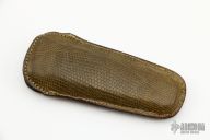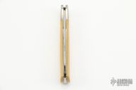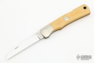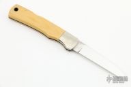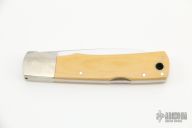 This lockback D/A automatic by John Hoskins features a mirror polished blade, dovetailed nickel silver bolsters, liners, and button, micarta scales with a stainless steel backspacer.  Includes a lizzard skin slip sheath. Has a few light scratches, otherwise excellent condition.