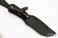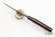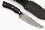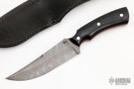 This Kovda from Olamic Cutlery features a Damascus trailing point blade with a false top edge, .179" blade stock and 1.517" blade depth, full tang construction. The handle has black G-10 scales with red G-10 liners and stainless steel pins. 4844 stamped on ricasso. Includes a black leather sheath with belt loop, padded and zippered case and maker's card dated 8-18-21. Excellent condition.