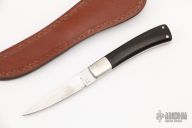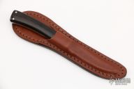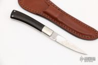 This knife features a mirror polished drop point blade with a full tang construction.  .113" Blade Stock.  .568" Blade Depth.  The handle features dovetailed nickel silver bolsters and micarta scales.  Includes a brown leather sheath.  Light scratches are visible on the knife otherwise the knife is in excellent condition.