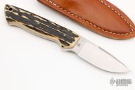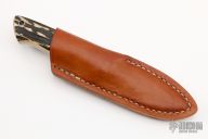 This Drop Point Hunter by Reese Bose features a drop point blade with false top edge, .155" blade stock and 1.163" blade depth, full tapered tang construction. The handle has stag scales with a lanyard hole. Excellent condition. Comes with original brown leather sheath.