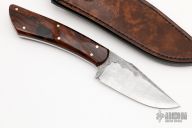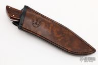 This XO Executive Officer by Master Smith E. Scott McGhee of Guinea Hog Forge features a Damascus (1095 and 15n20) clip point blade with false top edge, .163" blade stock and 1.442" blade depth, full tang construction. The handle has desert ironwood scales with nickel silver pins. Includes a brown leather sheath by E. Scott McGhee. Excellent condition.