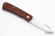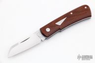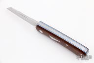 This Hitchcock slipjoint by Nick Timpson of Birdvis Knives features a satin finished blade with nail nick. The handle has 1920's Westinghouse Propeller Micarta covers, blue and white liners, stainless steel escutcheon, stainless steel liners and spring. Has half-stop, flush in all positions. Comes with original box, brown leather sheath and COA dated 10/2021. Excellent condition.