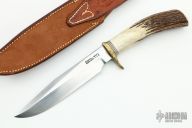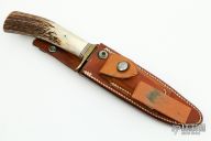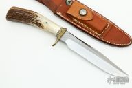 This Model 5 Camp and Trail Knife by Randall Made Knives features a satin finished blade with false top edge and notched thumbrest, .205" blade stock and 1.142" blade depth, hidden tang construction. The handle has a brass single guard and a stag grip with red/white/blue spacers. Comes with a brown leather sheath with belt loop, original paper wrapping, box and papers. Excellent condition.