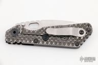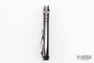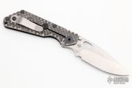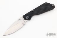This SNG DGG by Strider has a stonewash spear point blade with dual thumbstuds, thumbhole, and a notched thumbrest. 3/4 grind. Handle is black G-10 and bead blasted titanium "Gunner Grip", lockbar stabilizer, and stonewash finish titanium tip up clip. Nice detent, lockup and blade seating. Has some light scratches on the clip, has a couple light scratches on the frame otherwise excellent condition.