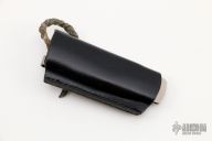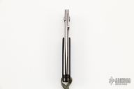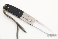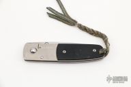 This Mel Pardue design is a liner lock with black G10 scales and orange peel finished titanium liners. Blade is satin finished and partially serrated. Very nice small pocket folder that's very lightweight. Great lockup, no blade play, excellent detent and seating. Comes with a black leather sheath. Has some scratches, otherwise good condition. Nice little vintage discontinued Benchmade.