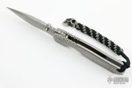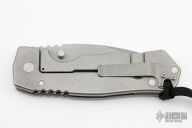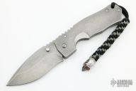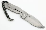 This Satu framelock folder from Grayman Knives features a spear point recurve bead tumbled blade with dual thumb-studs and notched thumb-rest. The handle has a tumbled titanium frame, black G-10 back-spacer, and tip up titanium clip. Great blade seating, detent and lock up. Comes with a zipper case. Has a couple light scuffs, excellent condition.