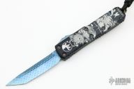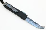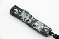 This UTX-85 by Microtech features a laser engraved tanto blade with fullers. The handle has a black contourned aluminum handle with blasted and anodized hardware and a bronzed tip down clip. S/N 94668 and dated 05/2018. Comes with original box and papers. Excellent condition. Says "Art By JB" in the relief of the thumbslide.